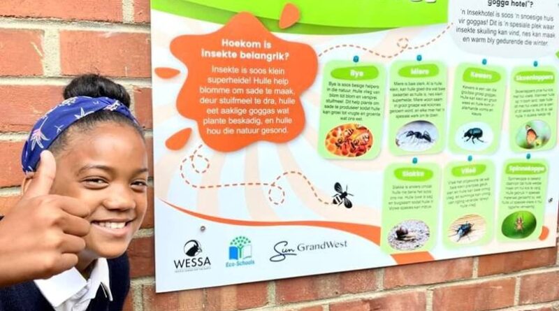 CAPTION: Riverton Primary School learner with the Insect hotel (Gogga Hotel) information board.