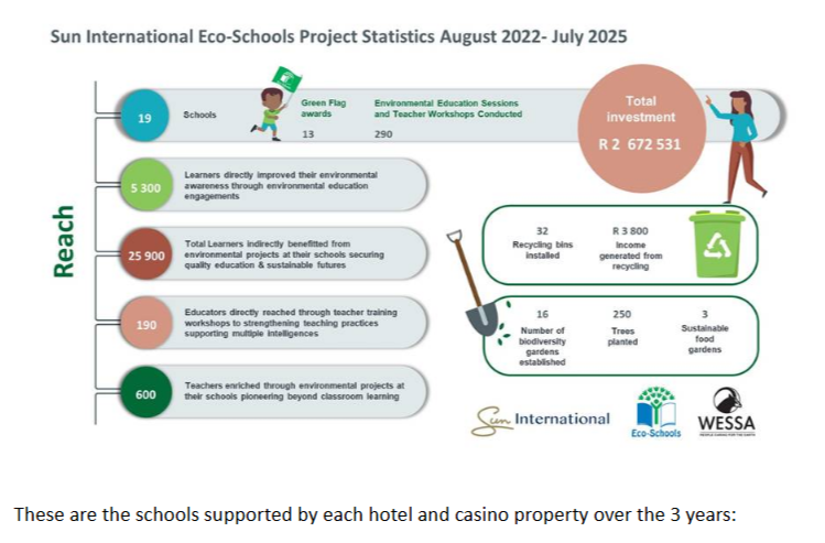 The Sun International Eco-Schools project has enabled 19 schools to educate their communities about environmental care, reaching over 25,900 learners and 600 teachers.